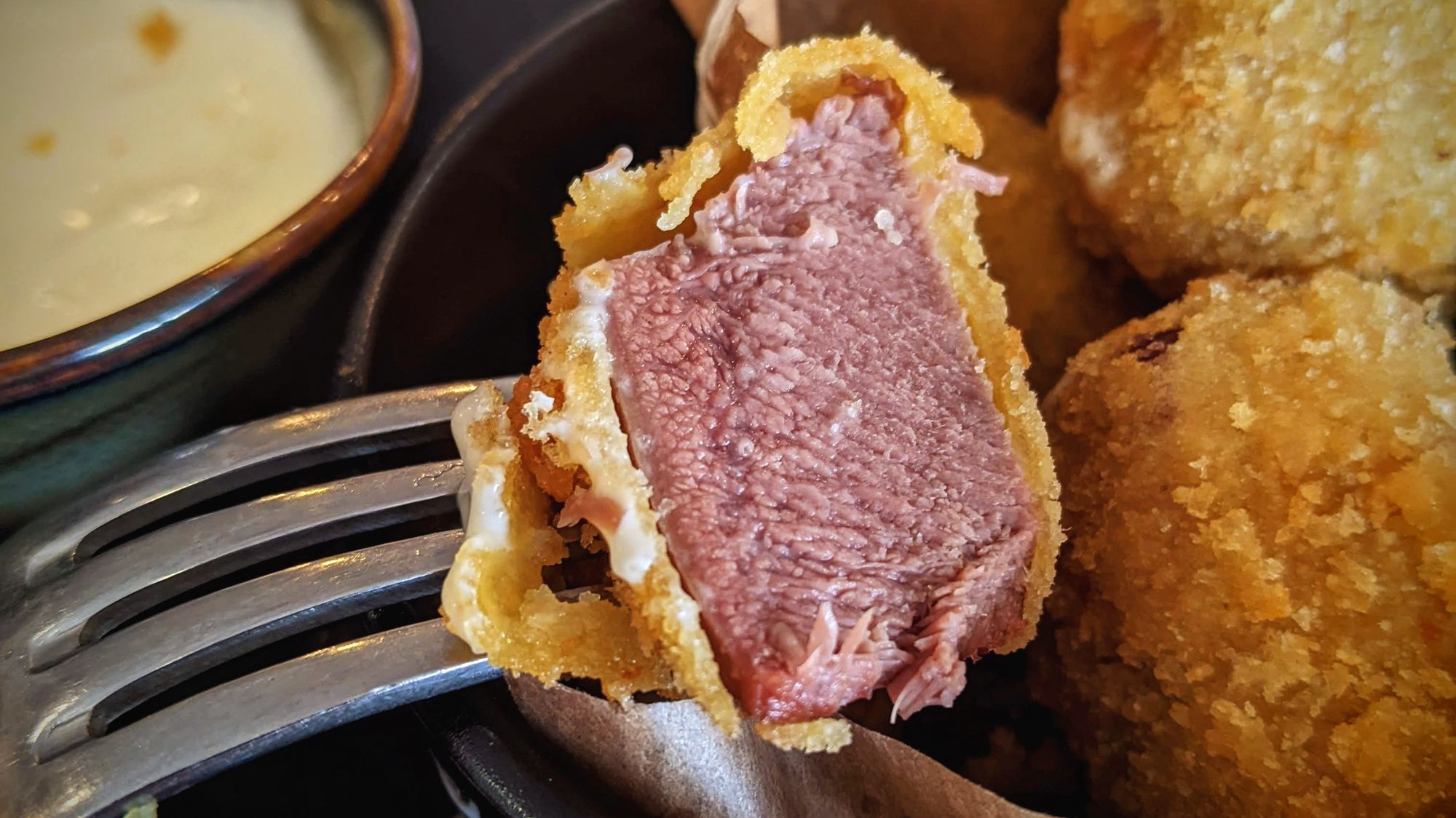 A szemem rögtön megakadt az egyik előételen, a rántott marhanyelven (2800 Ft), ami teljesen hozza, amit ígér. Puhára, már-már krémesre készített nyelv, tényleg ropogós bundában, enyhén tormás brie-vel és egy jóval pikánsabb zöldalmás-zelleres relish kíséretében.