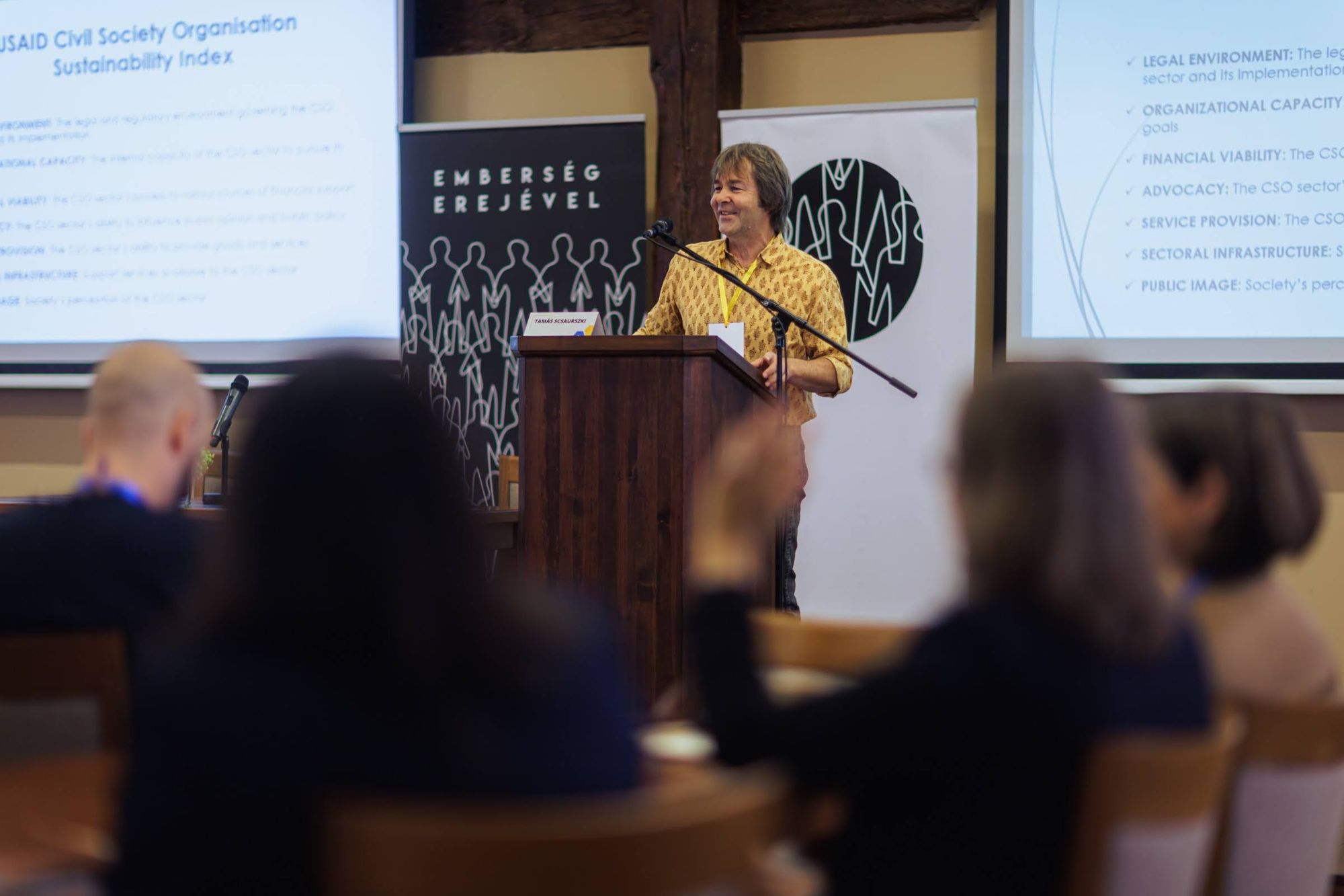 „Ez már nem az a világ, amilyennek gondoljuk” – mondta Scsaurszki Tamás, a közösségfejlesztéssel, szervezeti támogatással foglalkozó Gyökerek és Szárnyak Alapítvány vezetője. Az egyébként zárt konferencián arról tartott előadást, hogy az USAID, vagyis az Egyesült Államok Nemzetközi Fejlesztési Hivatalának globális civil fenntarthatósági indexe hogyan alakult az elmúlt 20 évben. A felmérés hét szempont – például a jogi keretek, a források elérhetősége vagy éppen a civil szervezetek – megítélése alapján, helyi szakemberek segítségével próbál országok közötti összehasonlítható eredményt adni.