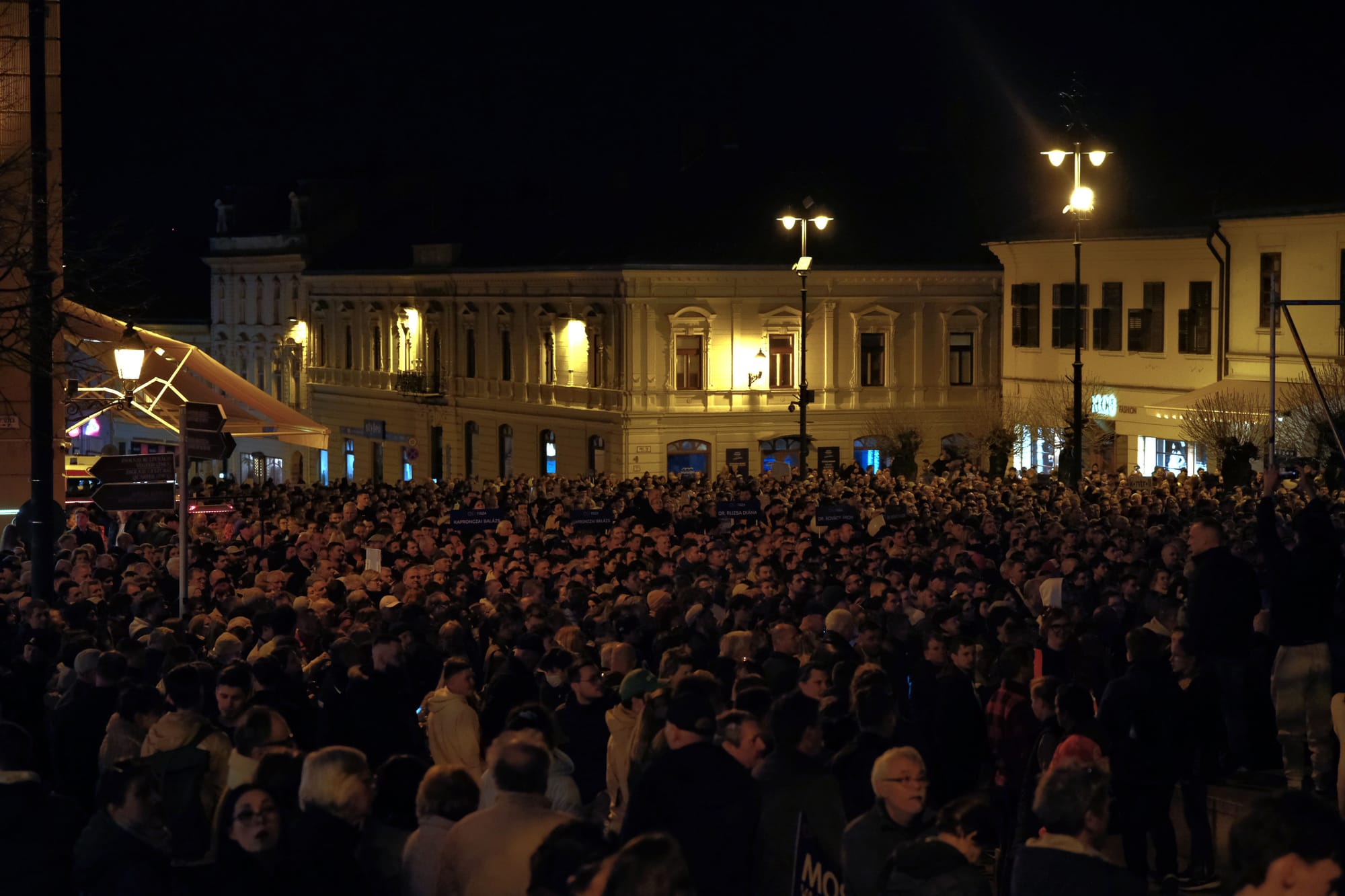 A húsz perc csúszással induló rendezvényre folyamatosan érkeztek az érdeklődők, többezres tömeg töltötte meg a Széchényi teret, amit a hasonló rendezvényektől eltérő módon rendeztek be, így a főtér szobra nem osztotta meg a közönséget.